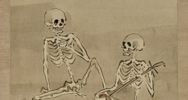 骸骨のピクニック。弁当広げて一人が三味線弾いてる♪そしてもう一人は片膝たてて酒をひっかける…そんな水墨画作品。
