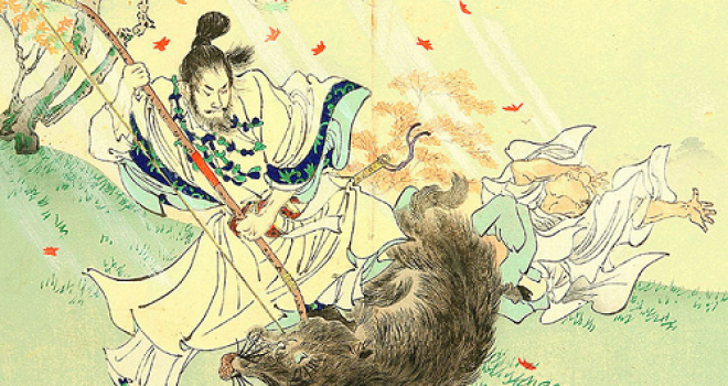 時は雄略天皇十八474年8月、伊勢国で叛乱を起こした朝日郎(あさけの いらつこ)の討伐に出た物部目たちですが、朝日郎の弓勢を前に総大将の物部菟代(もののべの うしろ)はすっかり意気消沈。