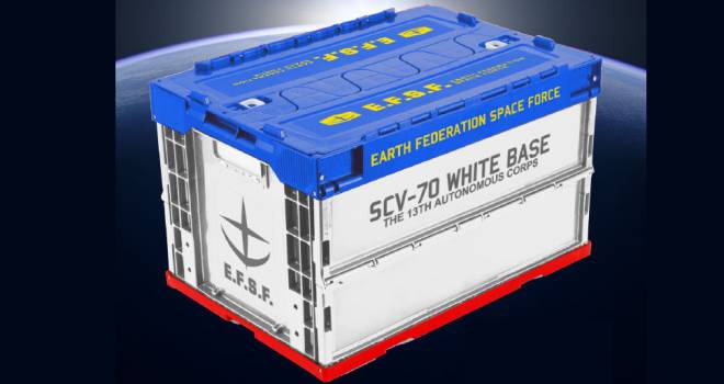 アニメ「機動戦士ガンダム」に登場する地球連邦軍の宇宙戦艦「ホワイトベース」での使用をイメージした、折りたたみコンテナが登場しました。