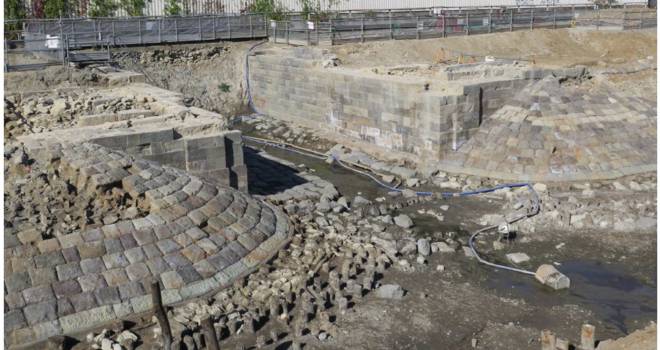 約150年前の明治初期に構築された「高輪築堤」が高輪ゲートウェイ駅前の再開発中に出土