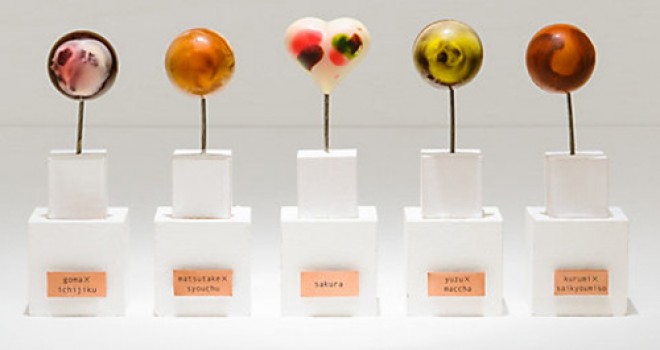 右から(1)胡桃×西京味噌、(2)柚×抹茶、(3)桜、(4)松茸×焼酎、(5)胡麻×無花果。意外な組み合わせにさらに興味をそそられます。