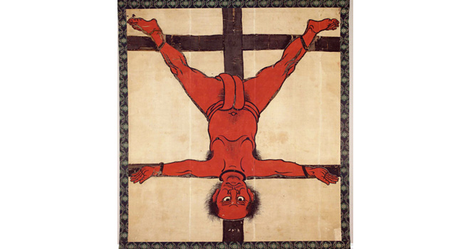 鳥居は長篠の勝利を見ずして散りましたが、その壮絶な末路は敵味方を問わず感銘を与えました。処刑前の鳥居と親しくなった武田家家臣・落合左平次道久は、磔になった鳥居の姿を絵にした旗指物でその勇気を讃えました。半裸で逆さ吊りにされた厳つい風貌をした男性の意匠が施された旗指物は、今も現存しています。