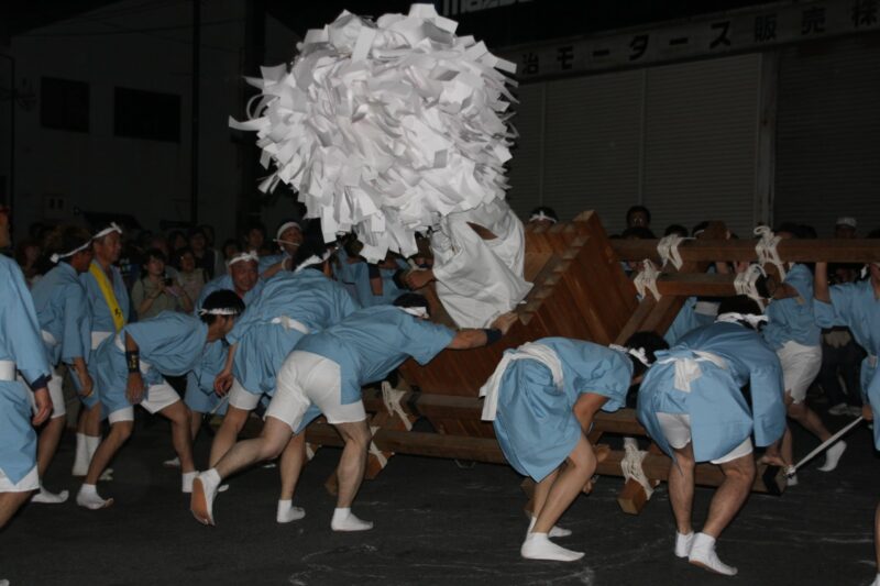「宇治神社御旅所」では、23時になると「県祭奉賛会」の担ぎ手たちがお祓いを受け「梵天渡御」に出発し、約1時間半ほど、独自ルートでの巡行を行います。
