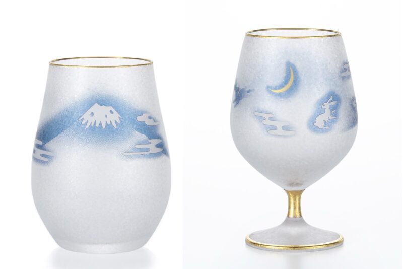 シリーズ初となる“富士山”は、江戸時代に中国から伝わった陶磁器の絵付け技法“吹墨(ふきずみ)”から着想し、さらに“月兎(げっと)”といわれる月とウサギが描かれた縁起柄を組み合わせることで、ひとつの風景として楽しんでいただけるグラスに仕上げています。