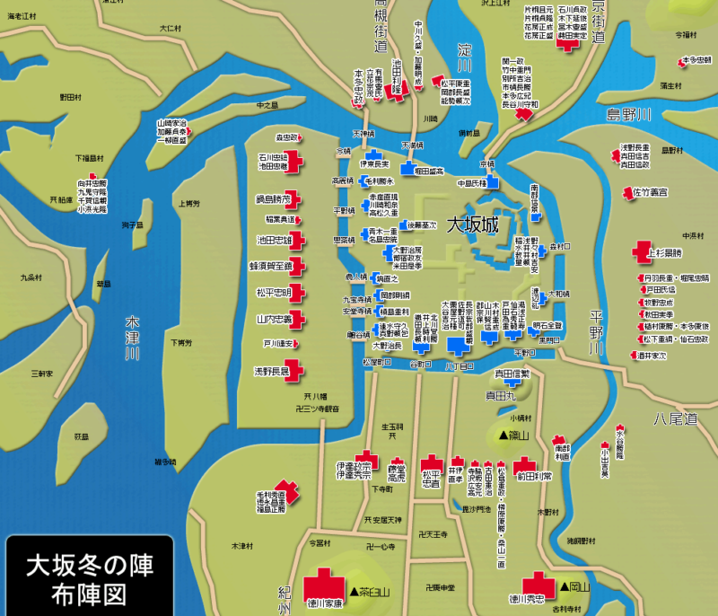 これに対し、後藤基次、真田信繁、長宗我部盛親、毛利勝永、明石全登ら五人衆をはじめとする牢人勢を加えた豊臣方は、10万の兵で迎え撃ちます。
