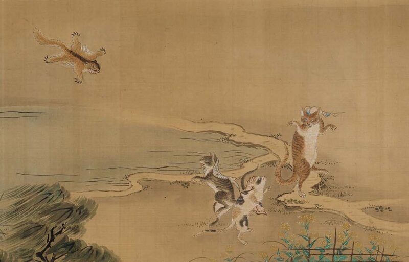 他の作品と同様に猫又や河童、一つ目小僧などがコミカルな姿で描かれていますが、細部にまで丁寧な描写が見られ、石燕の上手さが随所に見られる作品かと思います。松の木やその他の植物も細かく描きこまれているのも注目ポイント。