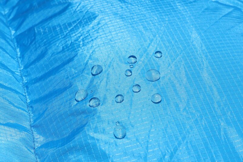 水色の部分に独自の防湿透湿ナイロン素材「オーロラテックス」を採用しています。撥水性が高く、水分は水滴となってはじくのでダウンを水濡れから守って高い保温力を保つとともに、発汗による蒸れも防ぎます。汚れも落ちやすいです。
