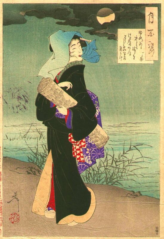 「暫く遠のき、夜鷹めずらしく」とは、老中・水野忠邦による天保の改革で徹底的な風紀取り締まりが行われ、夜鷹の姿が一時的に街から消えたことを指しています。