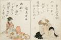 朱楽菅江は元文5年(1740年)10月24日に誕生(元文3・1738年生まれ説もあり)。元は先手組の与力でした。狂歌に目覚めたのは安永年間(1772~1781年)の初期ごろ。同門の大田南畝(おおた なんぽ)、唐衣橘洲(からごろも きっしゅう)、平秩東作(へづつ とうさく)らと活動を開始します。また妻の節松嫁々(ふしまつのかか。幕臣・小宮山昌俊女。実名ちか、通称まつ)と組んで朱楽連(菅江連)を結成。狂歌ブームの一助となりました。