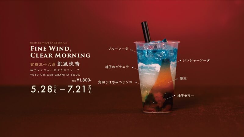 「赤富士」という呼称で有名な《凱風快晴》は、シート状に固めた寒天を一枚一枚カットし、カップに貼り付けて富士山を表現した『柚子ジンジャーのグラニテソーダ』です。