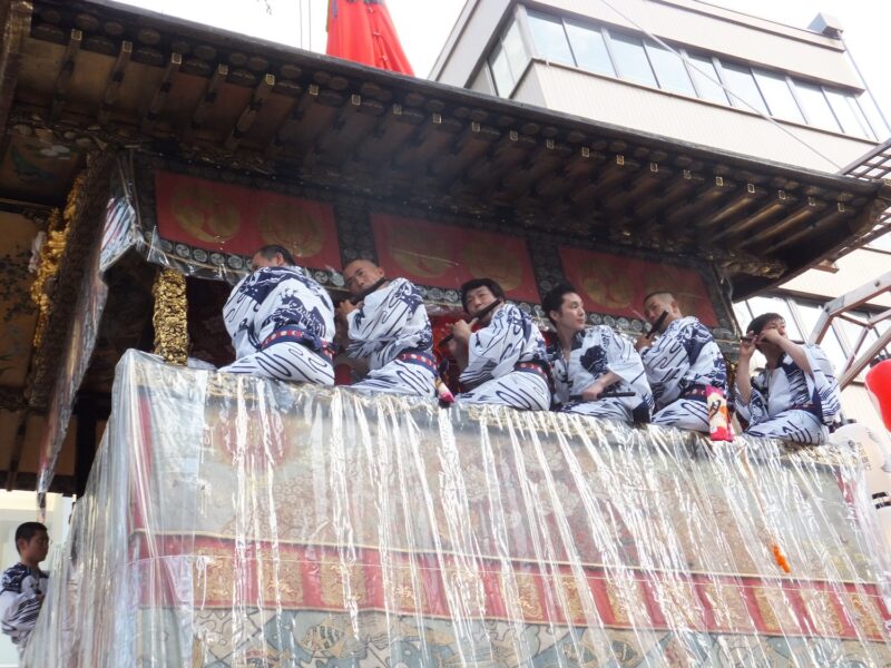 山鉾巡行が近づき、鉾町に祇園囃子が流れ始めると、町は一気に祭りムードに包まれます。そして巡行当日には、交代要員も含めておよそ40人が鉾に乗り込み、絶え間なく囃子を奏で続けるのです。