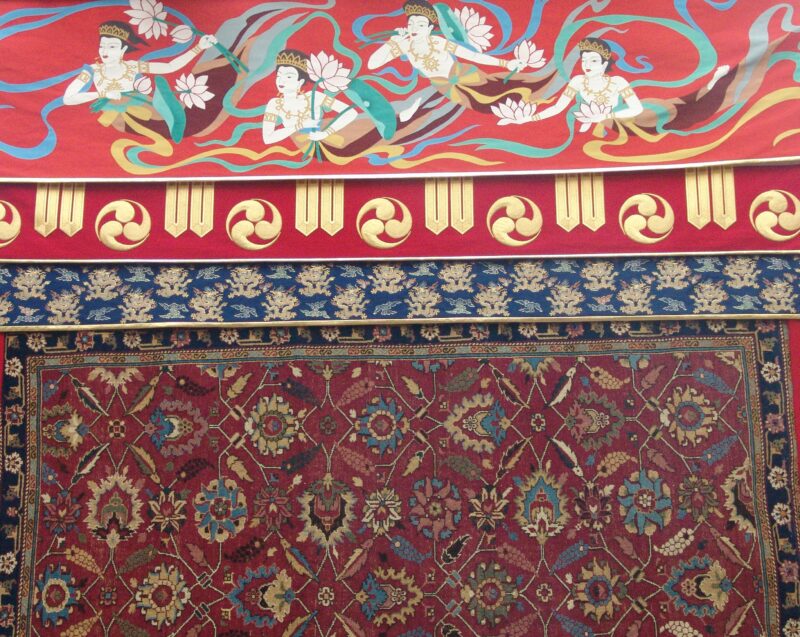 たとえば、長刀鉾の前掛には「ペルシャ花文緞通(かもんだんつう)」、胴掛には「中国玉取獅子文緞通(たまとりししもんだんつう)」といった、18世紀頃の優れた緞通が使われています。見送には、中国・明代の「雲龍図綴錦(うんりゅうずつづれにしき)」が用いられており、いずれも非常に貴重なものです。
