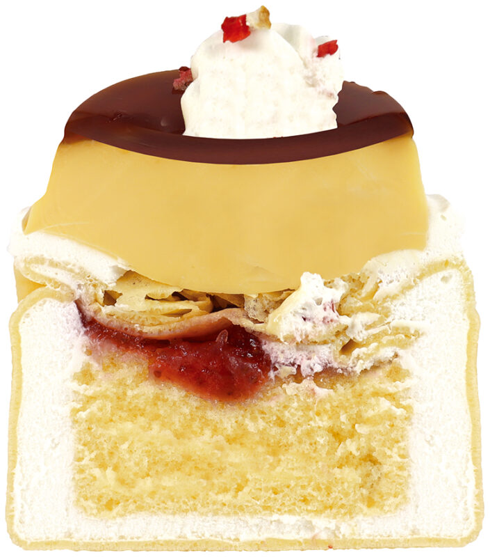 シフォン生地と苺ジャム、シャンテリークリームをクレープで包み込み、上面にプリンをのせたボリューミーな一品。ヒッピースタイルを思い起こさせる花柄の敷紙で、レトロ可愛く仕上げられています。