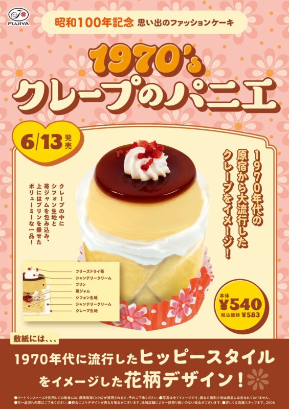 2025年は昭和100年であることから、不二家洋菓子店が開始した「昭和100年記念 思い出のファッションケーキ」企画の第2弾として、「1970’s クレープのパニエ」が発売。