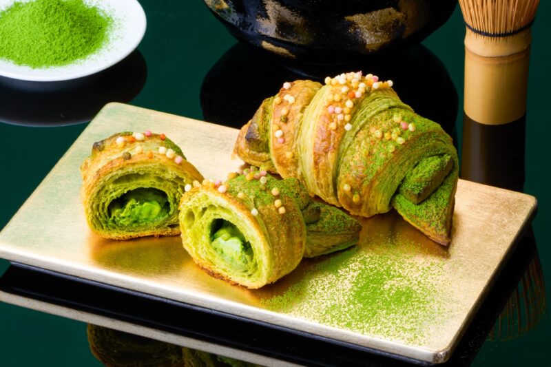 祇園辻利の宇治抹茶を練り込んだ特別なクロワッサン生地を使用。祇園辻利の宇治抹茶を使用した濃厚な宇治抹茶チョコレートと宇治抹茶クリームを生地で包み込みしっとりと焼き上げており、噛むたびに香り高い宇治抹茶の風味と味わいを感じられるように仕上げられています。