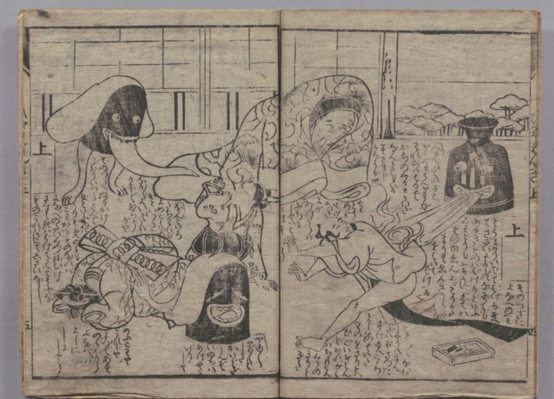 ユニークな作品としては、1779年(安永8年)刊行の『妖怪仕内評判記』(ばけものしうちひょうばんき)、があります。妖怪のような化け物がたくさん登場してくるのですが、インターネットのない江戸時代、これだけの発想力や想像力の持ち主であることには驚かされます。