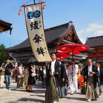 7日(月)の午後2時から、八坂神社にて「綾傘鉾稚児社参」が行われます。顔を真っ白に化粧し、金色の烏帽子に狩衣姿の綾傘鉾稚児6人が役員とともに八坂神社に社参し、神事の無事などを祈願するのです。