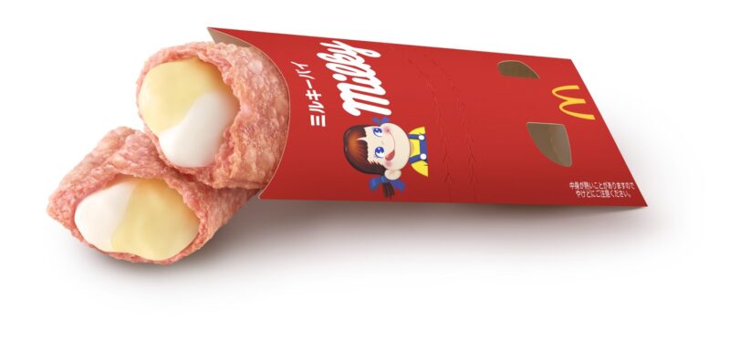 不二家の代表ブランド「ミルキー」とマクドナルドのホットパイが夢のコラボ。サクサクの生地に、2種類の異なる練乳クリームを詰めた、まるでミルキーな味わいの温かいスイーツパイです。