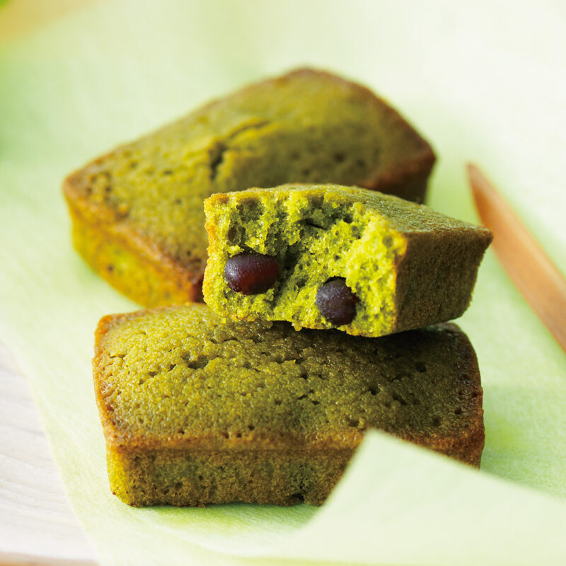 中には、抹茶と相性のよいふっくらとした小豆の甘納豆を加え、しっとりと焼き上げています。抹茶の程よい渋みと小豆のさりげなくやさしい甘さが口の中に広がります。