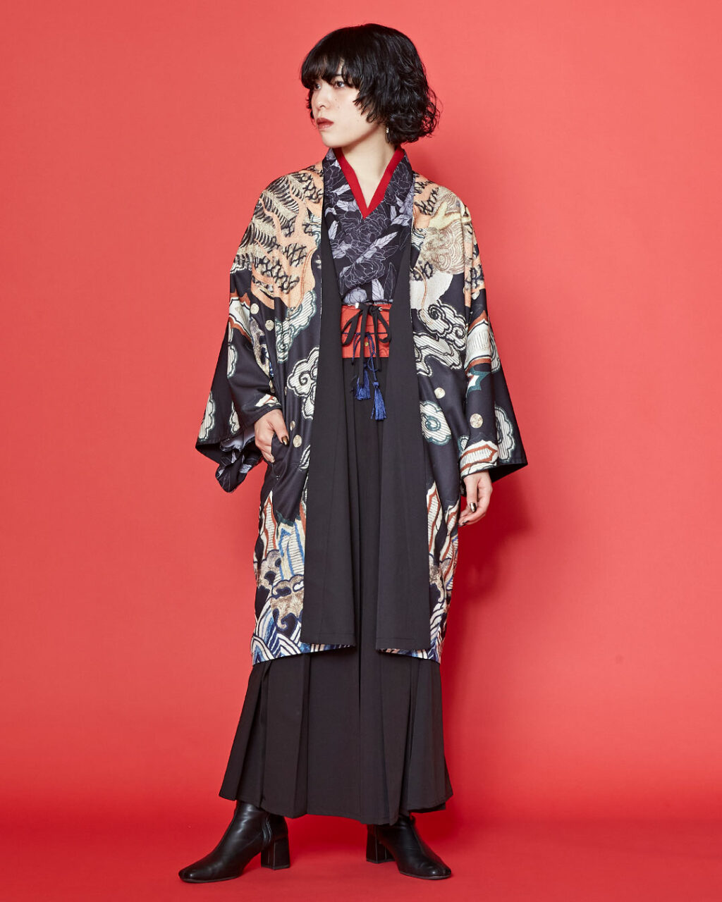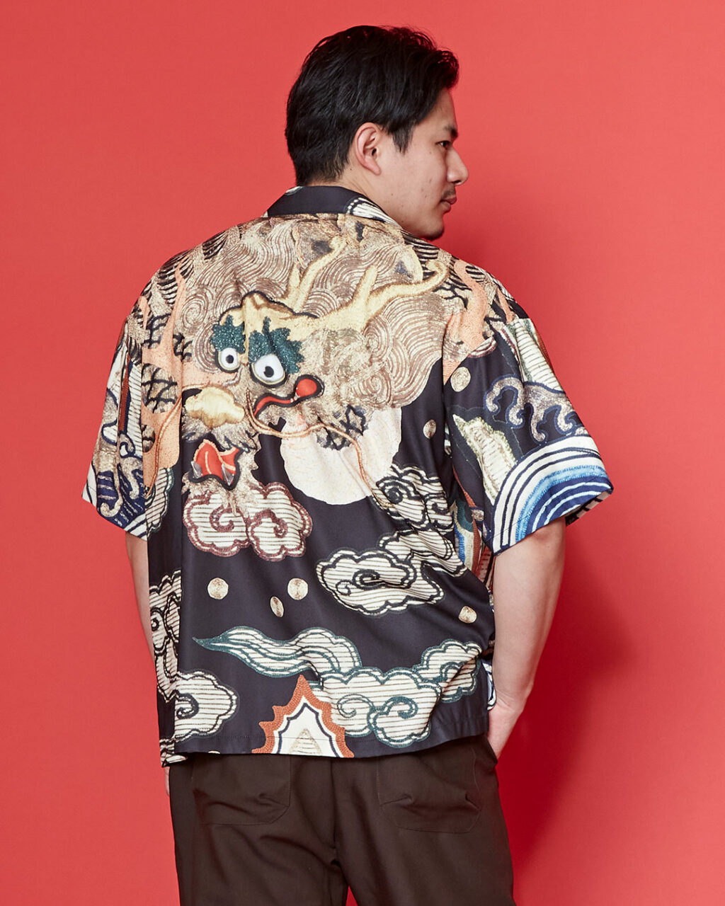 着物のようなロングシルエットが特徴の羽織は、力強い龍柄とシンプルな無地の両面を楽しめるリバーシブル仕様。装いや気分に合わせて着回しができ、シーンを問わず活躍します。ゆったりとしたサイズ感で、男女問わず着用できるユニセックスデザインです。