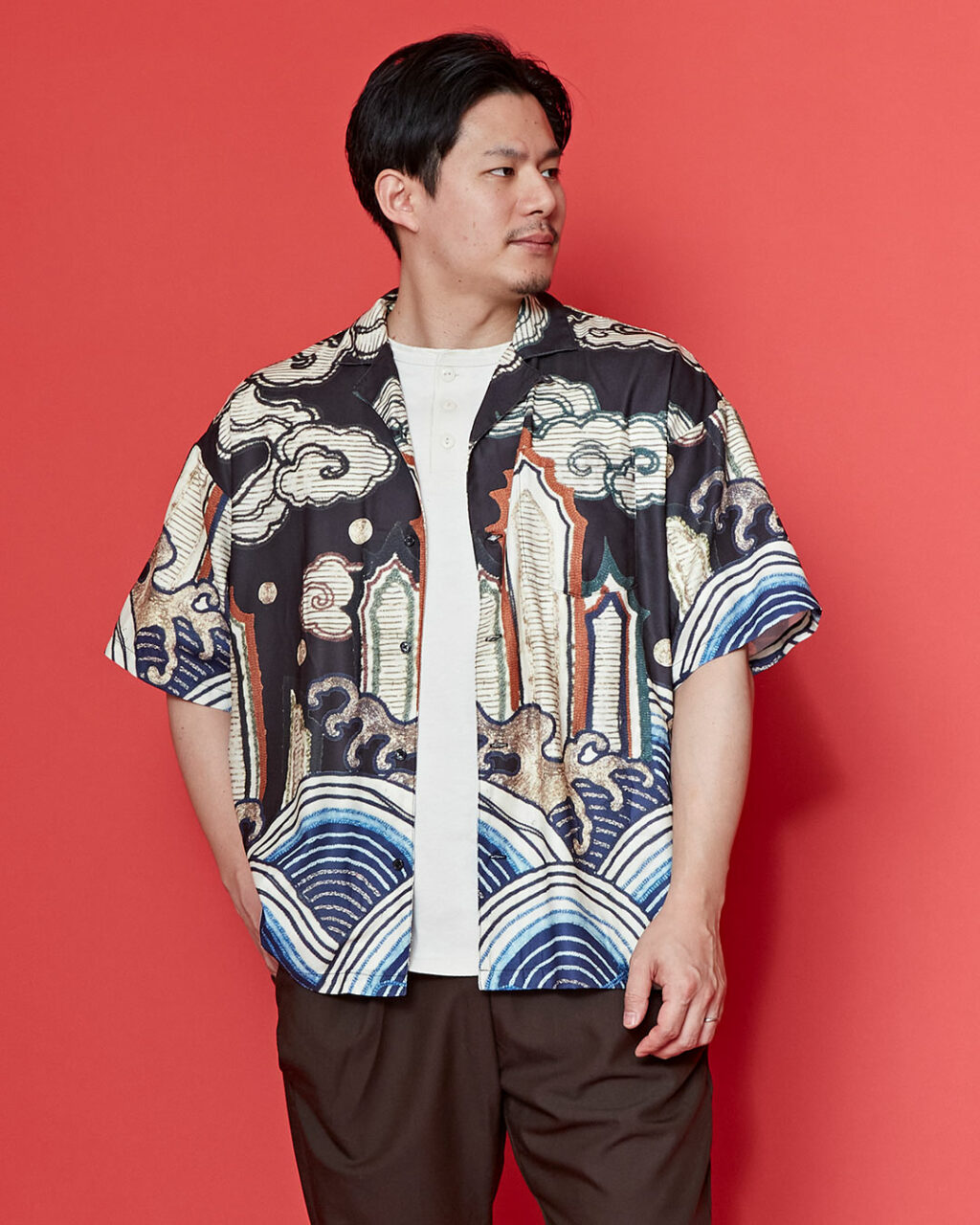 さらりとした着心地の日本風アロハシャツ。ゆったりとしたサイズ感で、羽織りとしても着られる一枚で、男女問わずに着用できます。