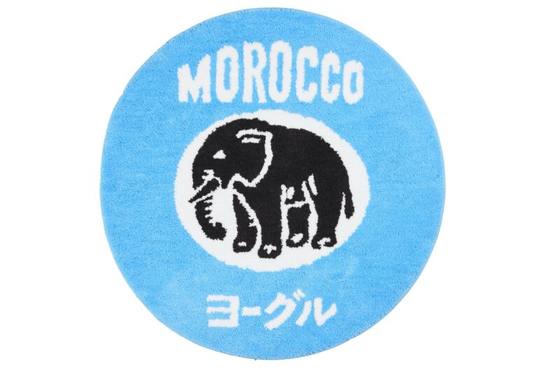 モロッコヨーグルのフタをイメージした直径 90 cmの BIG サイズのラグ。優しいゾウさんに包まれたような気分になれる少しノスタルジックでレトロ可愛いデザイン。