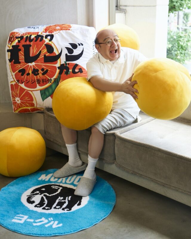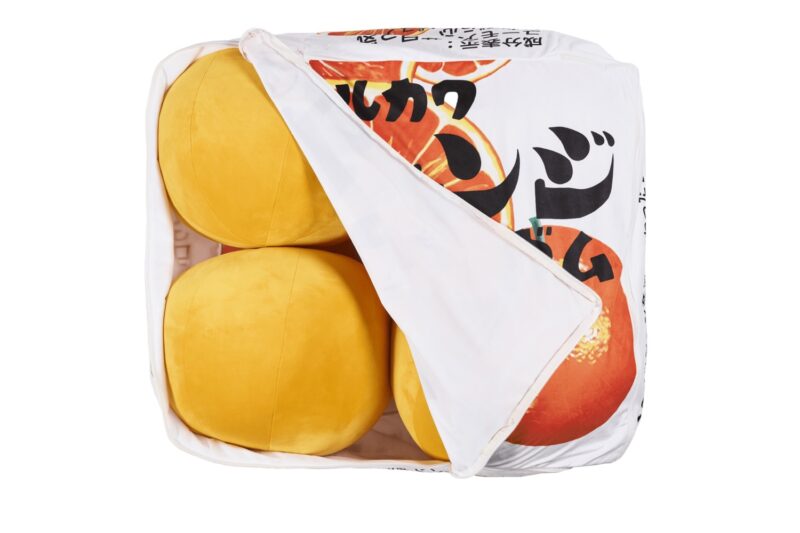 オレンジフーセンガムのパッケージを再現したカバーに、ガムのようなもちもち食感のクッションが 4 個入った直径 40cm の特大クッションセット。カバーの側面の心に染みるメッセージにも注目。
