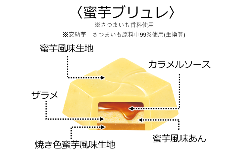 本商品は、蜜芋と呼ばれる品種である安納芋を原料中99%使用したチロルチョコです。ザラメ&カラメルソースで“カリッ&とろ~り”のW食感でブリュレの食感を再現しています。