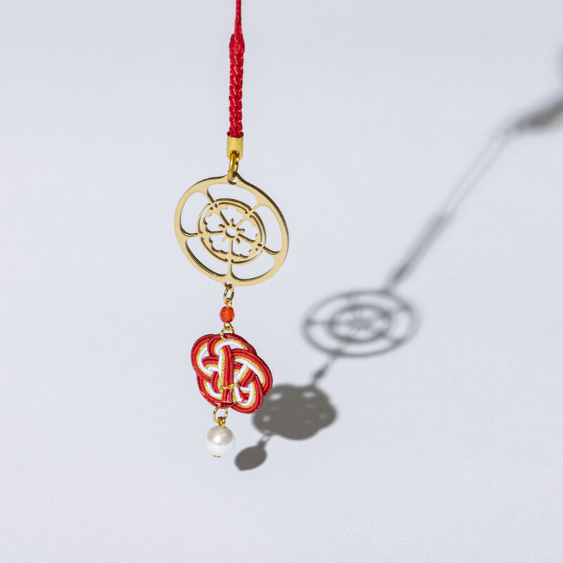 チャームの下には、水引を独自アレンジした飾りが付いています。水引は白・赤・青・紫の4色。