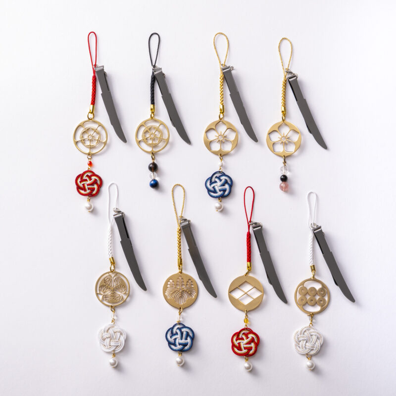 家紋の下には、人と人との縁を結ぶ縁起物「水引」と、身につけた人の邪気を払い、出会いを生み出す「パワーストーン」が継いています。刀型のクリップは、ワンタッチで取付け・取外しが可能。