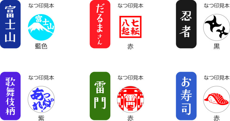 ラインナップは、「富士山」「だるまさん」「忍者」「歌舞伎柄」「雷門」「お寿司」の6種類。印面サイズは丸型直径9mm、角型7.5×7.5mm。