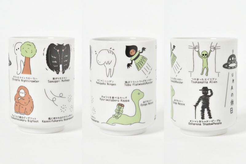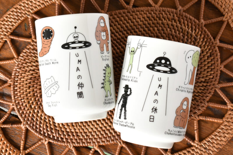 そんなUMAが、ゆるカワなタッチでぐるりと一周にわたり描かれた「YURU-MA寿司湯呑」。「UMAの仲間」と「UMAの休日」の2種類がラインナップされています。