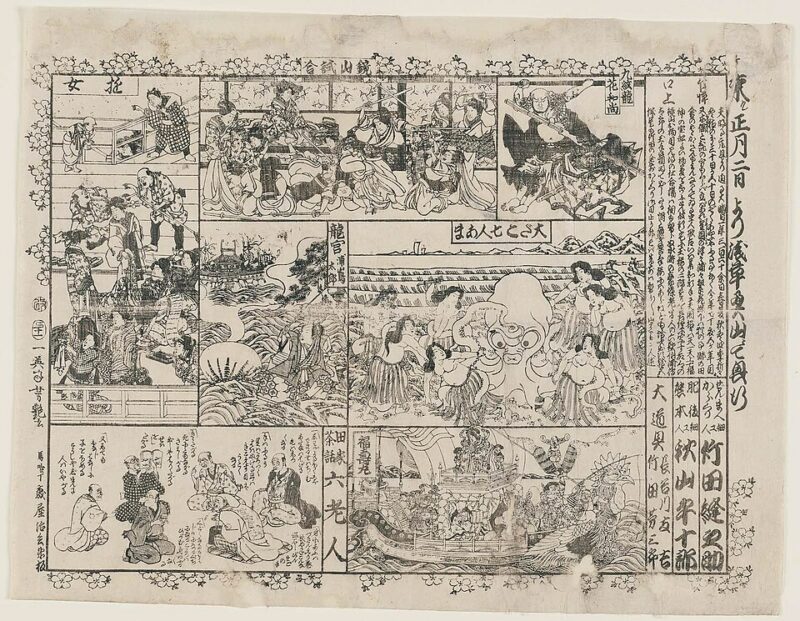 こうした見世物では、籠や貝、瀬戸物などで伝説の人物や鳥獣草木の巨大な人形・細工をつくり、興行にかける細工見世物も好評でした。