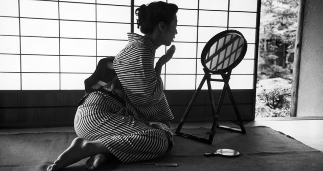 これはとっても美しい写真。和室でひとり、化粧をする浴衣姿の女性。1951年の作品です。