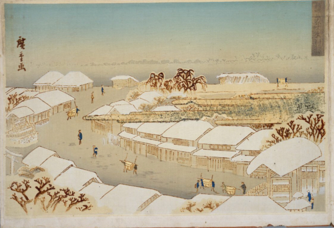 歌川広重「新吉原雪の朝」国立国会図書館蔵※くの字の道が衣紋坂、右手前が吉原大門