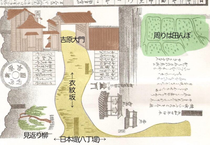 江戸末期新吉原見取り図(部分) 日本堤から大門まで(彩色、文字加筆:筆者)Wikipedia