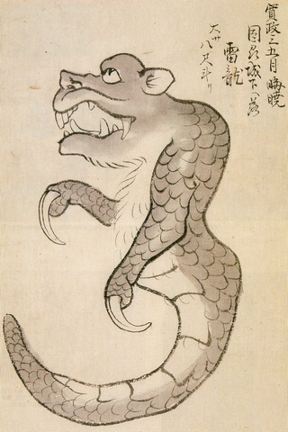 激しい雷雨の日に空を飛び、転げ落ちると激しく木を裂いたり人を傷つけたり、大きな被害をもたらした……駿河国/江戸後期『駿国雑誌』より