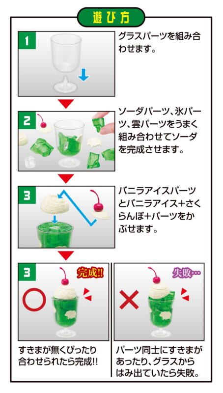 同シリーズ第9弾となる本商品は、グラスパーツの中に9個のソーダパーツ、4個の雲パーツ、3個の氷パーツを正しく組み合わせて、最後にバニラアイス、バニラアイスにのったさくらんぼを組むとクリームソーダが完成します。