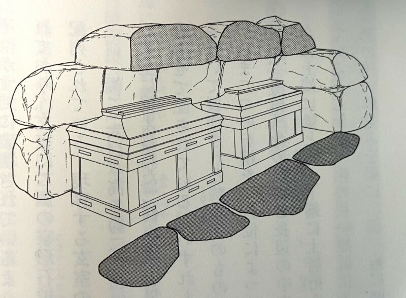 玄室に据えられた2基の家形石棺は、ほぼ同一の軸線上に配置されている。石棺の材質はいずれも竜山石の凝灰岩をくり抜いたものである。