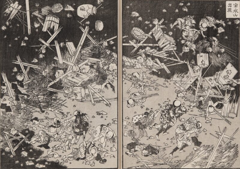 ドカン!ぐらぐら、ガラガラ、ズシン!そんな⾳や、体を揺さぶる振動さえ感じられそうな本図は、宝永4年(1707)に起きた富⼠⼭の噴⽕に伴う災害を描いたものだ。⼀夜にして出来上がった「宝永⼭」の出現を、あえて⼭の姿を描かずに、崩壊していく家屋や⼟煙で表現している。⼈間では到底敵わない⾃然界の⼤きな⼒と恐怖を感じさせる作品だ。