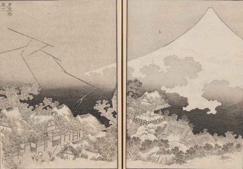 画面右には、大きくそびえ立つ不二の姿。その麓にはもくもくと怪しげな黒雲が湧き立っている。麓の村に吹く風は強くなりはじめ、家屋の茅葺き屋根を揺らしている。画面左上から伸びる線は、天からの落雷。直線を繋ぎ合わせたような面白い描き方で、一瞬の光の屈折を表現した。