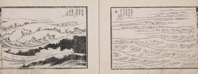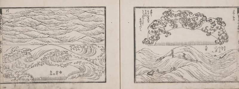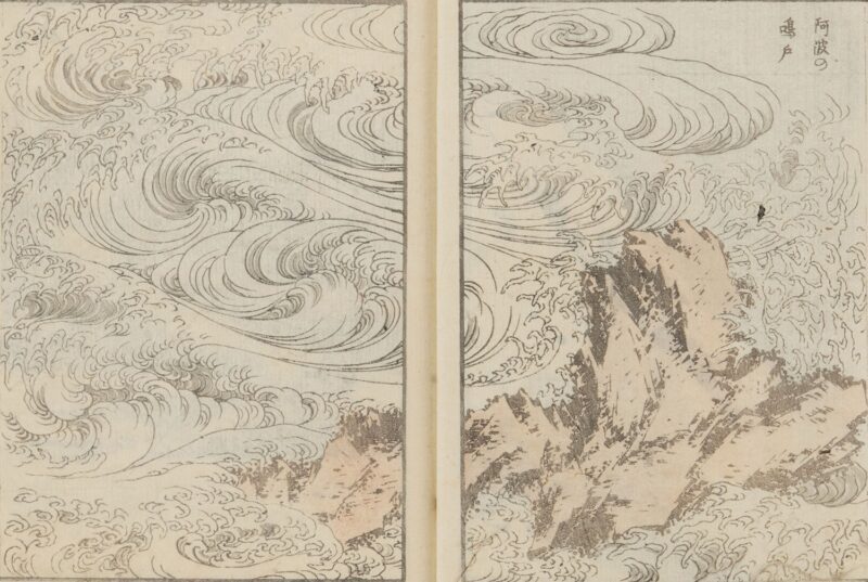 渦潮で有名な鳴門海峡の波の様子を描いた1ページ。大小さまざまなかたちの渦波は、互いにぶつかり合い形を変えながらまた渦巻く。右ページには切り立った岩が描かれており、鋭い岩肌の様子を筆先を跳ねさせたような筆致で表現してるのが印象的だ。無限に繰り返される波と波の衝突、そして形の変化を、北斎は映像を記録するように自身の目でとらえていたのだろう。