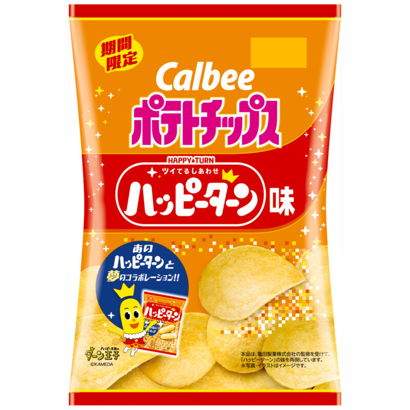 カルビーのポテトチップスから、”甘じょっぱ煎餅”の定番商品、亀田製菓の「ハッピーターン」とコラボレーションした、『ポテトチップス ハッピーターン味』が新発売です!
