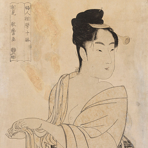 寛政2〜3年(1790〜1791年)の「婦女人相十品(ふじょにんそうじっぽん)」「婦人相学十躰(ふじんそうがくじったい)」はじめ、生気あふれる官能美で人々を魅了しました。