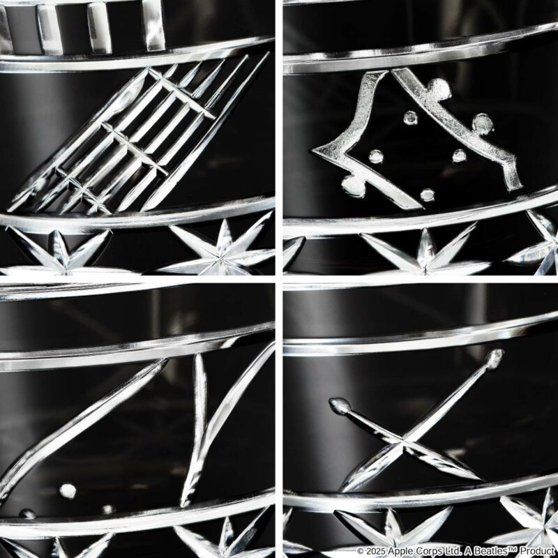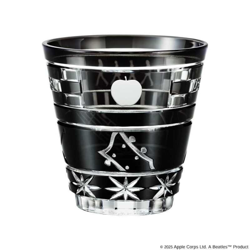 「THE BEATLES 江戸切子グラス」には、漆黒の色被せガラスに、アビイ・ロードの横断歩道を渡るメンバーのシルエットや楽器のモチーフ、英国のレンガの街並みをイメージした市松模様などが、伝統技法を用いて表現されています。