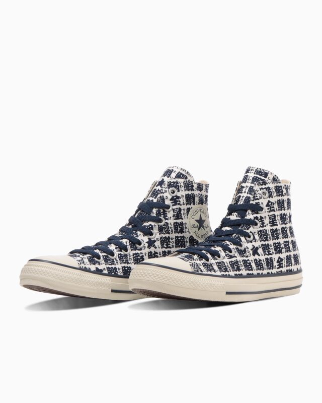 日本らしい文化を感じさせる「湯呑み(ゆのみ)」をモチーフにしたプリントアレンジモデル。アッパーには、様々な魚へんの漢字の中に、「オールスター」に漢字を当てた「全星(オールスター)」や手描き風の星マークを混ぜ込んだ、ユーモア溢れる特別なデザインをプリント。アッパーの柄に合わせてディテールをネイビーで統一し、モダンでファッショナブルに仕上げています。