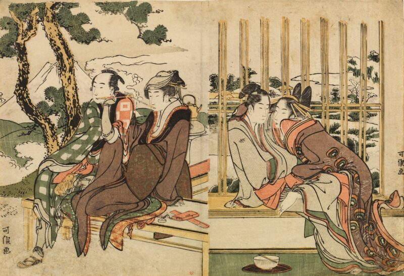 江戸時代、一点物の肉筆画に対し浮世絵版画は量産され、販売される商品でした。江戸を訪れた人が故郷への土産として買って帰る江戸土産のひとつとして、広く流通しました。