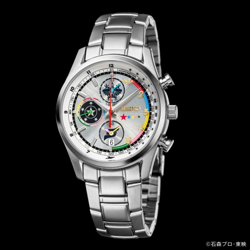 『秘密戦隊ゴレンジャー』の50周年を記念して特別に制作された、セイコーのクロノグラフモデル。「ゴレンジャーマシーン」をイメージした白銀の文字盤、ゴレンジャーの額(ひたい)の数字が金色に輝く様をイメージしたインデックスとともに、巧みに散りばめられた5色のカラーリングが映えます。