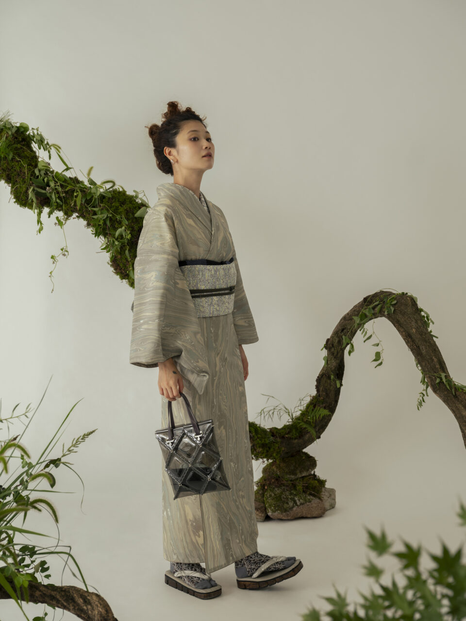 自然の移ろいと樹木の温もりを、ARCHを象徴する「墨流し」で表現したきもの。