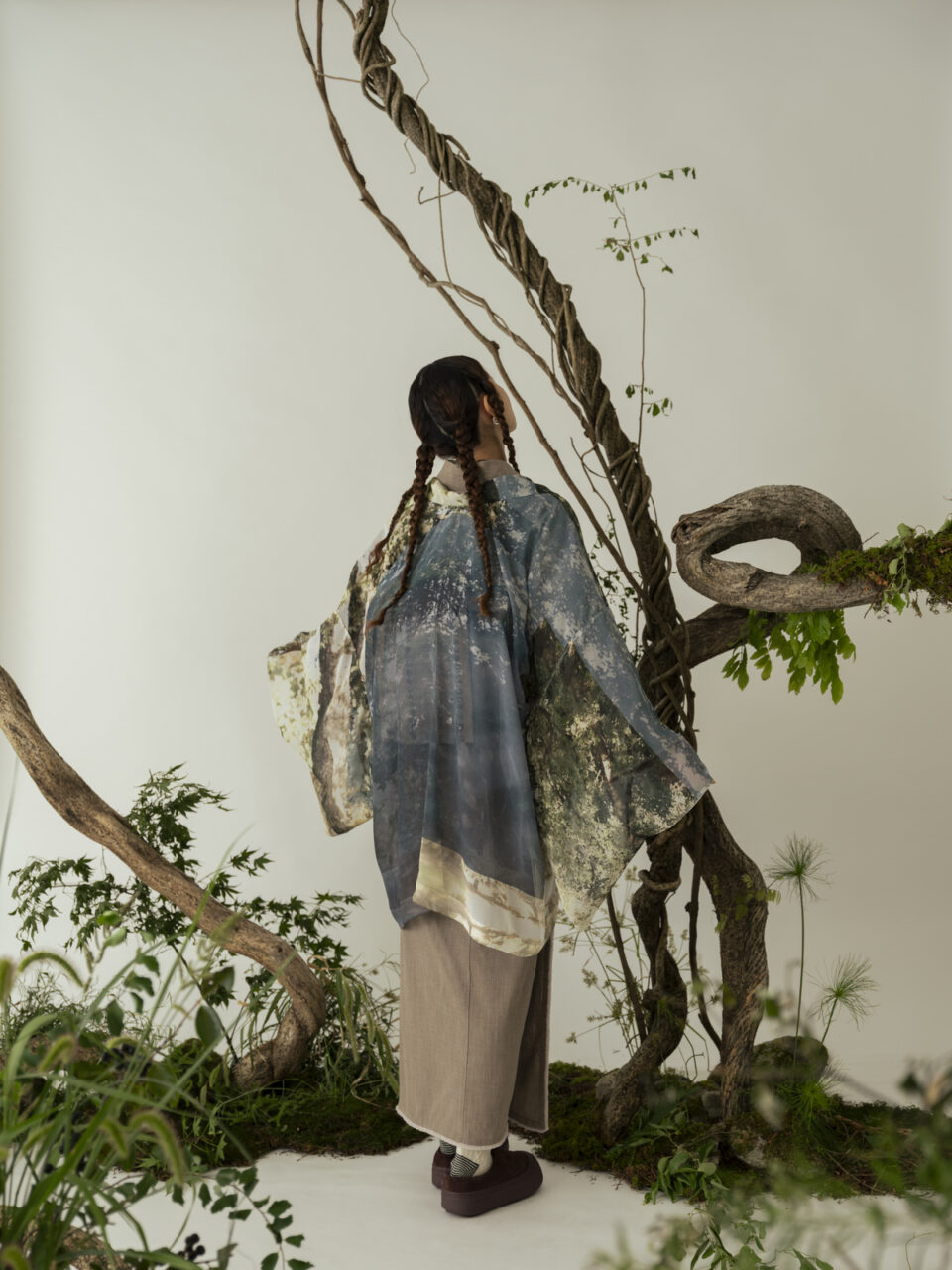ずっしりとした木の安心感、水の恵みや風の音、木漏れ日の柔らかさ——今シーズンのテーマを象徴する羽織。ARCHのフォトグラファーである小財美香子氏が、日常で何気なく撮りためてきた写真の中から、近くに有る穏やかさを思い返させてくれる写真を選びました。まるでその風景の中にいるような、風をまとう感覚を与えてくれる透け感のある素材を合わせています。着ているときの心地よさはもちろん、街中でもいつでも穏やかな空気をまとわせてくれる、趣のある一枚。